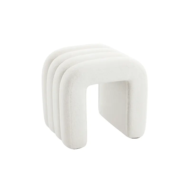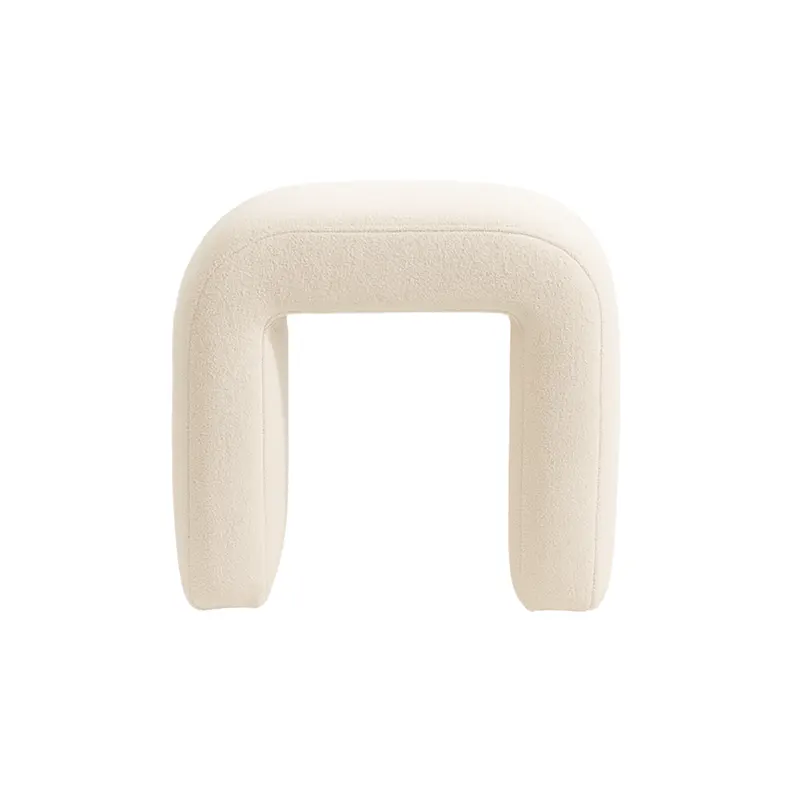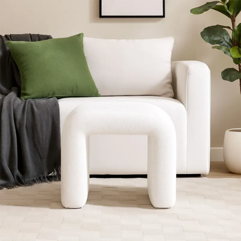 The Arcus Ottoman is where design and utility meet. With its sculptural U-shaped base and soft bouclé upholstery, this piece serves as a striking modern ottoman and functional accent.