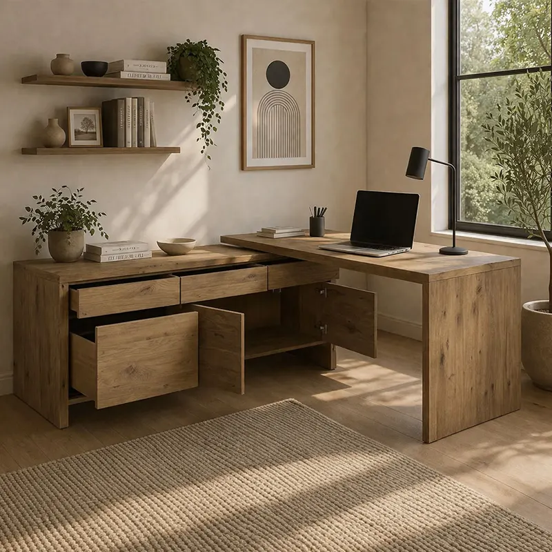 With its L-shape form, this l shape desk Dubai design gives more working space without making the room feel crowded. The extended top supports laptops, monitors, files, and daily office items with ease. Meanwhile, the drawer cabinet and side unit make it a practical wooden desk with storage for organized work.