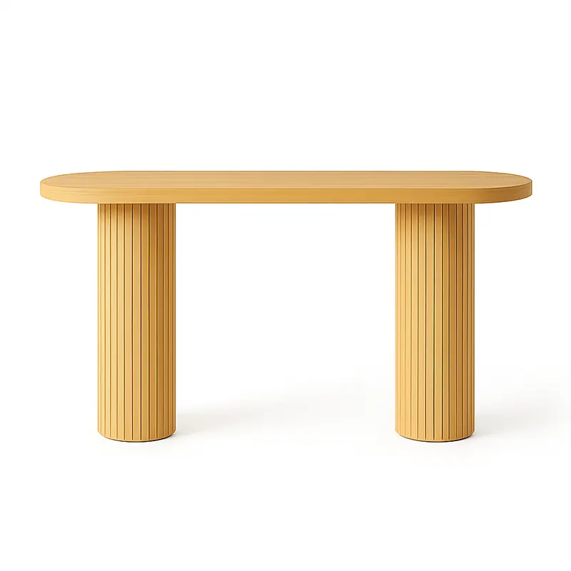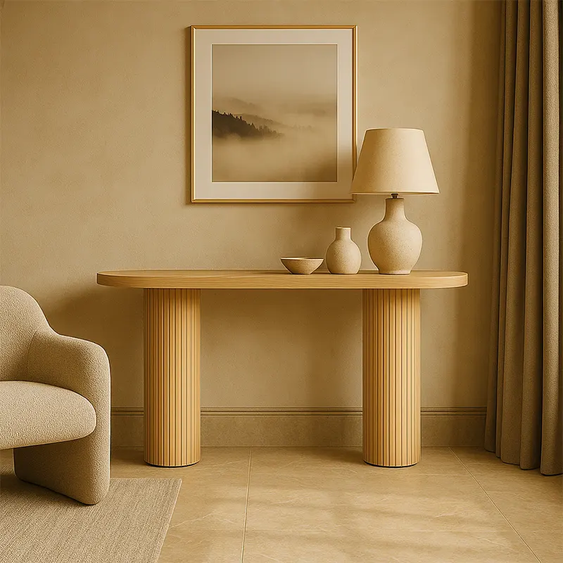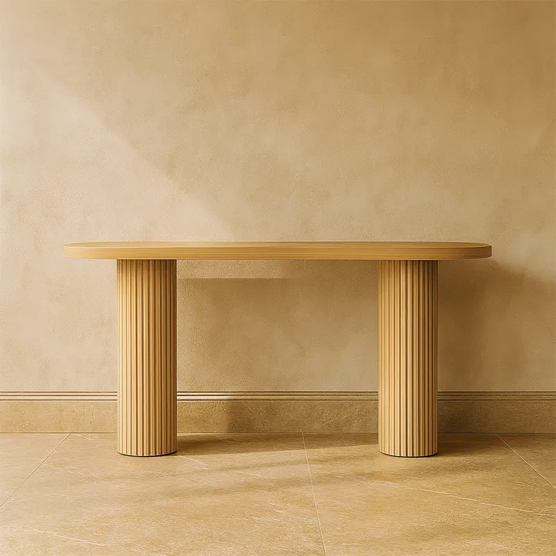 The Aurelia Flute Console brings sculptural refinement into modern interiors. As a Fluted Console Table, it adds warm oak tones and smooth curves to any space. Its rounded top and twin pillars also make it suitable for clients seeking a stylish Wooden Console Dubai piece.