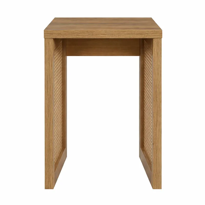 Crafted with a solid frame, the Aurex Cane Accent Table balances strength and visual openness. Cane panels on the sides introduce texture while allowing light to pass through, keeping the space feeling open. The flat top provides practical surface space, while the slim build ensures it fits neatly beside sofas, chairs, or beds. Finished in natural wood tones, it complements neutral, modern, and relaxed interiors with ease.