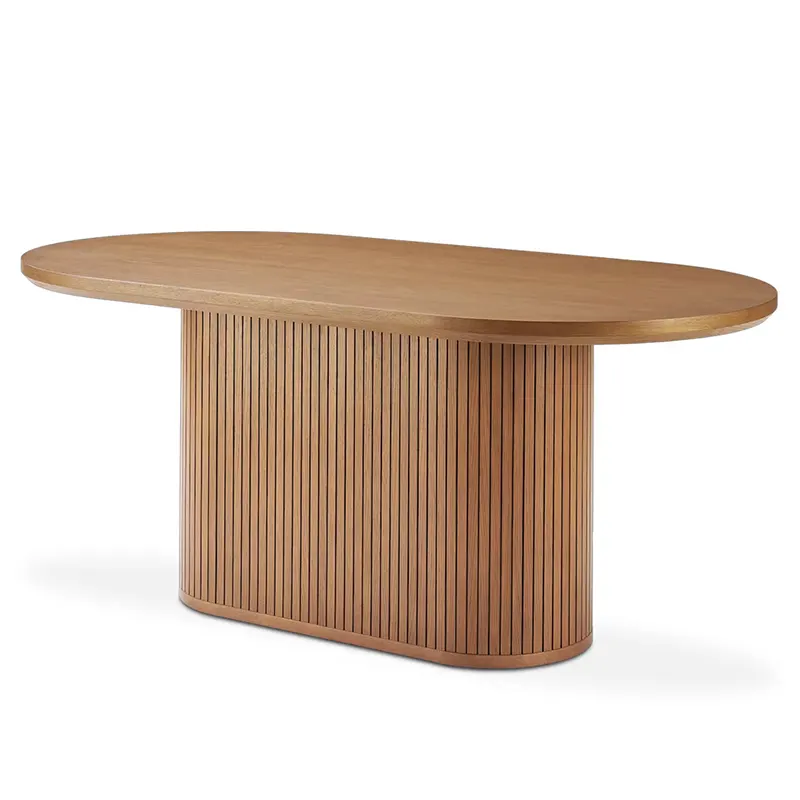 The Averra Flute Dining Table is a refined oval dining table crafted for modern interiors, whether in villas or apartments. Designed as a fluted dining table, it brings balance, warmth, and structure to everyday meals, while the wooden dining table construction adds lasting strength. With its sculptural pedestal and calm proportions, this modern dining table suits contemporary spaces, while its premium finish gives it the presence of a luxury dining table for elegant homes.