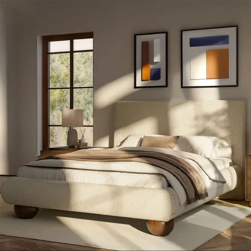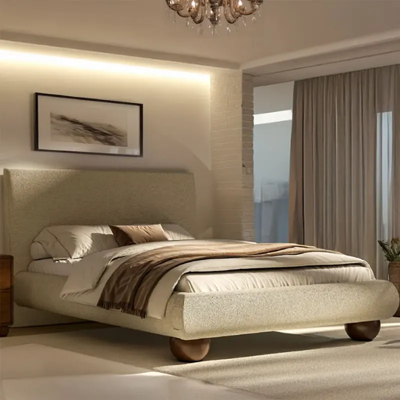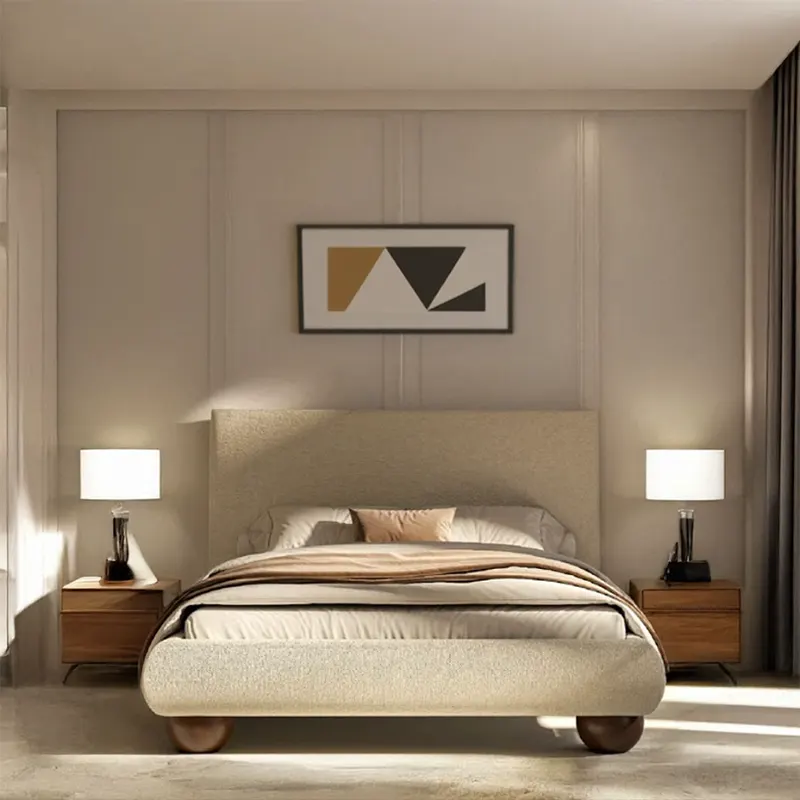 The Circa Comfort Bed by HOC Furniture blends a solid modern bed frame, soft bouclé fabric, and sculptural wooden legs. This custom made bed offers padded comfort, available in various sizes and finishes. Buy bed online across the UAE with 4-month EMI. A true luxury bed UAE and an affordable bed Dubai choice.