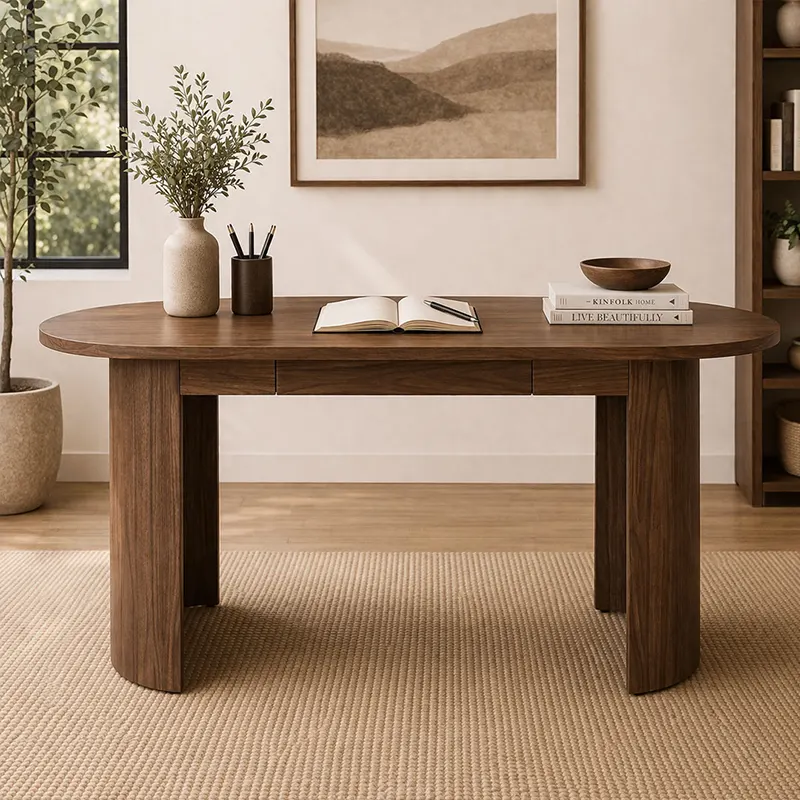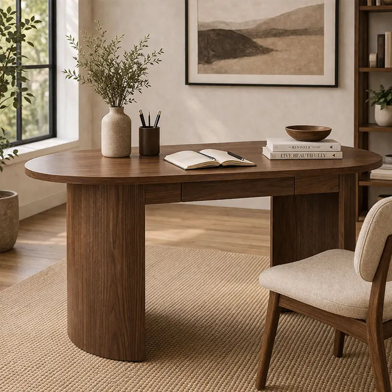 The Davian Drawer Desk by HOC Furniture is a modern and space-saving desk designed to bring style, comfort, and function into your workspace. With its soft curved shape, rich walnut-tone finish, smooth top surface, and hidden drawer storage, it creates a clean and elegant setup for writing, study, laptop work, and everyday office use.