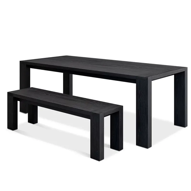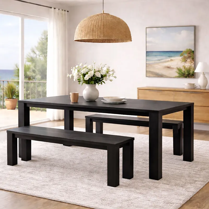 The deep black finish enhances the visual appeal, making this black dining set easy to pair with modern lighting and neutral tones. As a solid wood dining set, it is designed to handle daily use with confidence, while the dining table with bench format keeps the space open and functional.