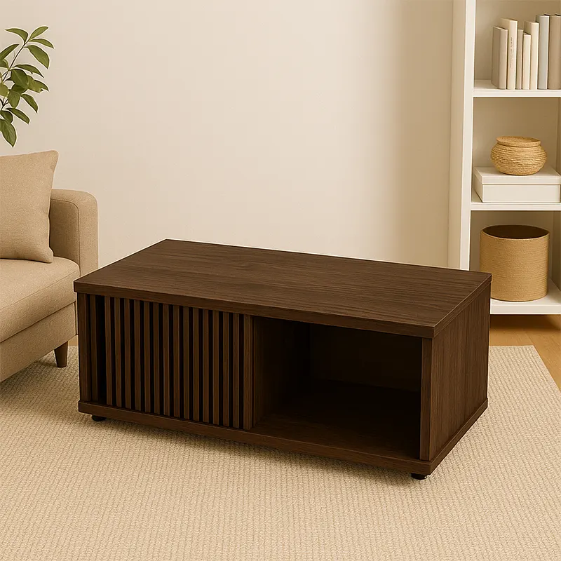 The low base design keeps the table grounded and visually light, ensuring it pairs effortlessly with modern sofas. With its carefully considered proportions, this modern coffee table maintains comfort and flow within the room. The combination of structure and storage makes it a wooden coffee table that supports both style and function, while the rectangular coffee table form ensures easy placement in different layouts.