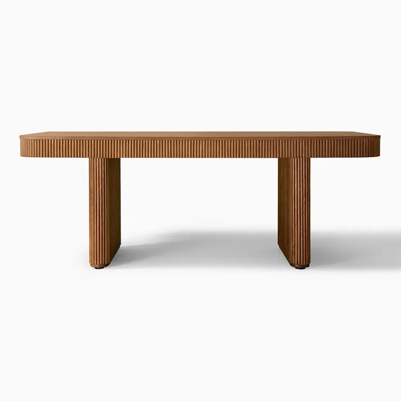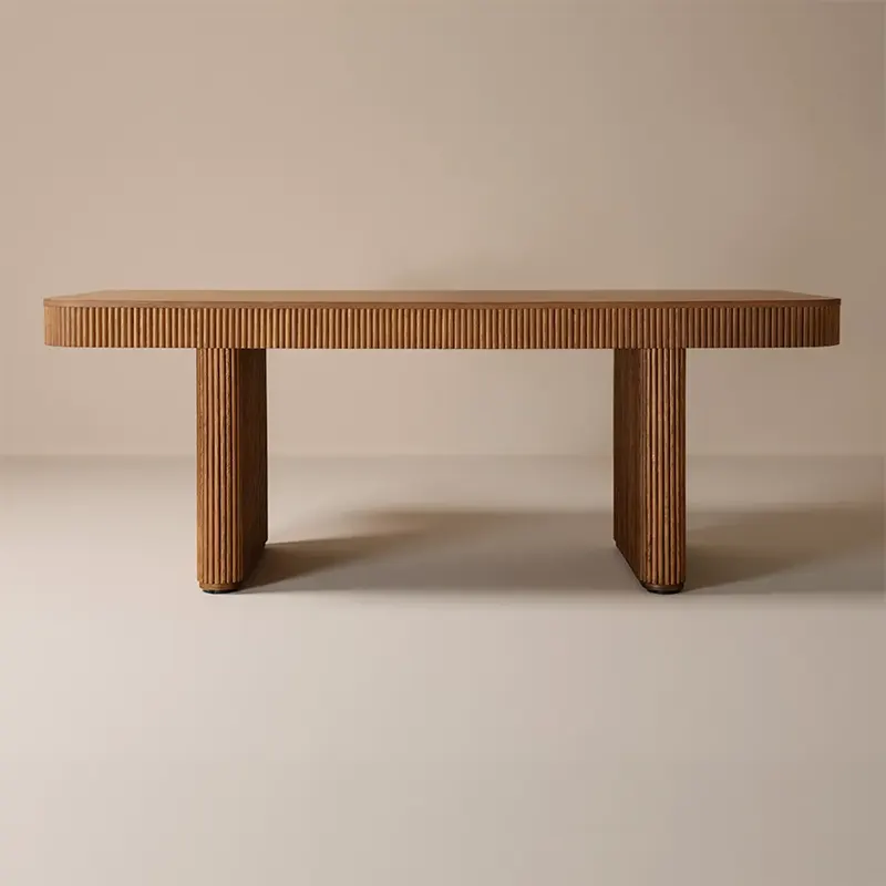 Modern custom made wooden dining table with grooved surface, seats 6–8, features veneer finish, and includes installation. Available with 4-month EMI across UAE.