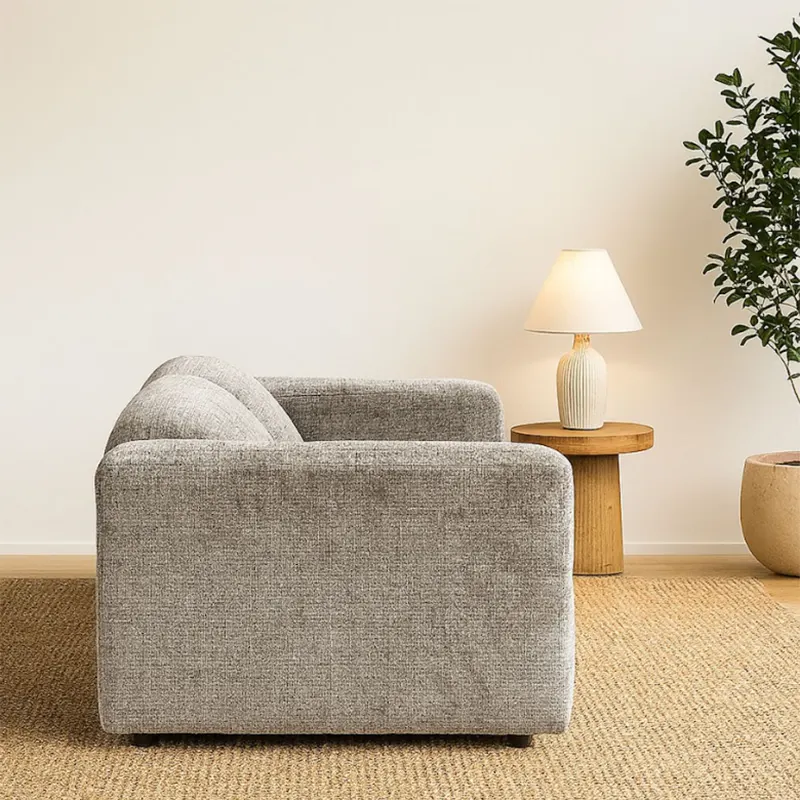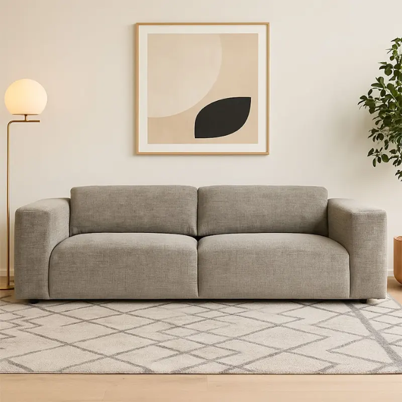 Built with a solid frame and plush foam padding, the Mesa provides generous comfort. As a custom made sofa, it uses textured fabric upholstery to add a warm and tactile feel. The low-profile shape and relaxed back angle give it a laid-back character, while the deep cushions offer full-body support for long sitting sessions.
