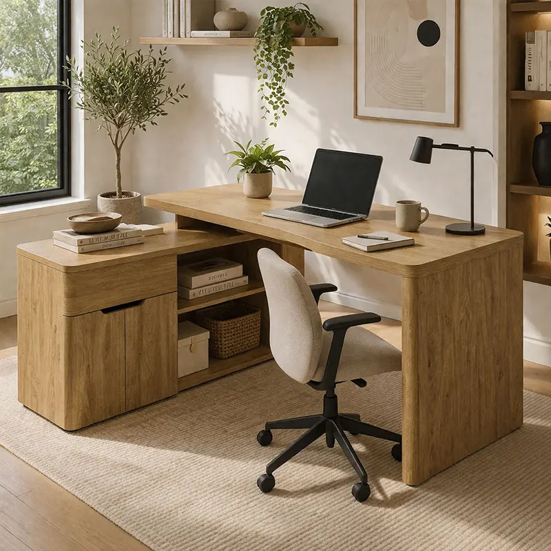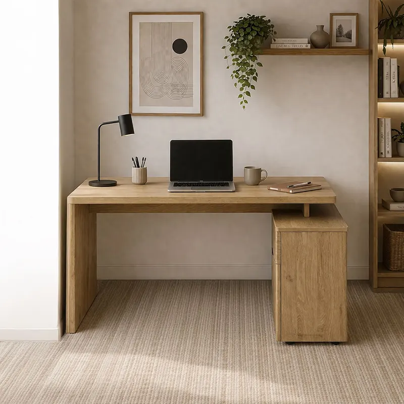 With its compact L-shaped layout, the desk creates an efficient workspace. It keeps everything within easy reach. The wide top supports work, study, and daily tasks. Meanwhile, the side storage adds function without taking extra space. Whether in a bedroom or office, this modern desk UAE adapts easily. It also keeps a neat and minimal look.