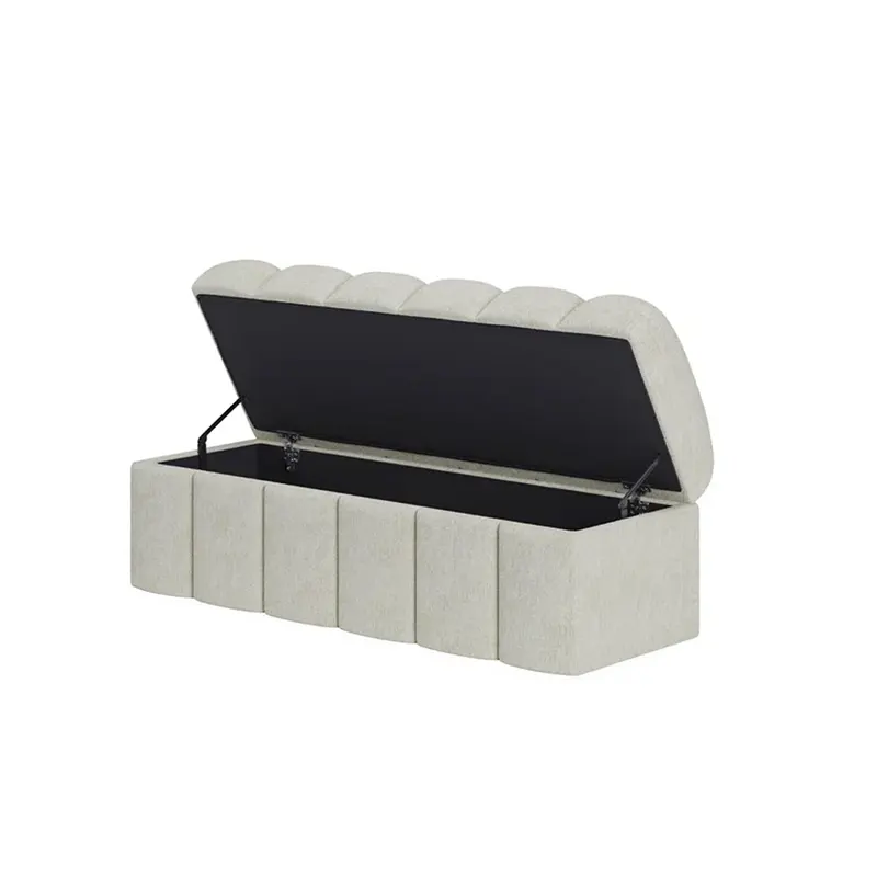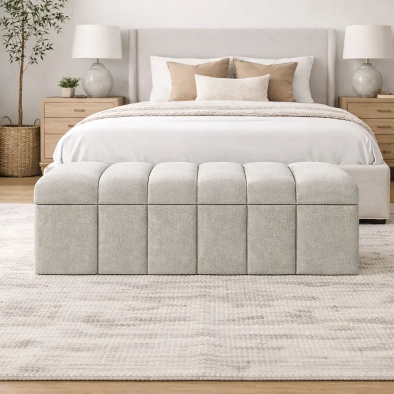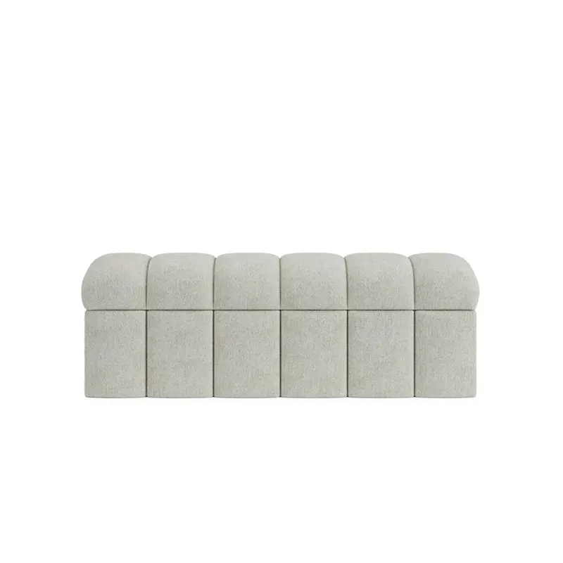 Crafted with a solid internal structure, the bench offers durability without visual heaviness. The rounded fluted design introduces subtle texture, while soft curved edges enhance safety and flow. As a well-proportioned storage bench UAE, it blends seating and storage seamlessly, while its refined finish reinforces its role as an upholstered bench Dubai for elegant interiors.