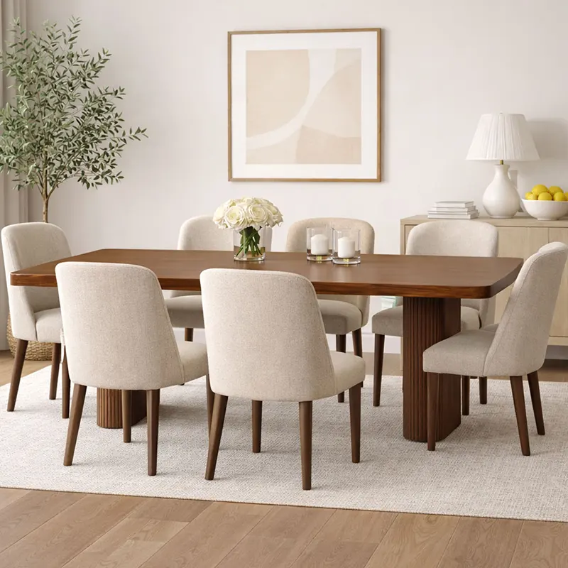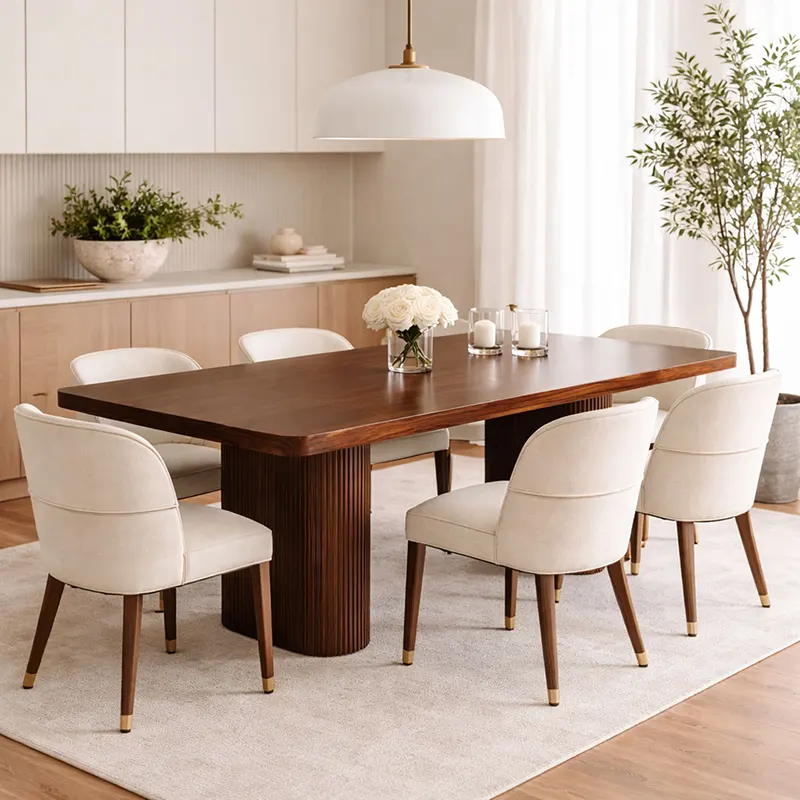 Built with a solid wood frame, the table ensures durability and long-term performance. With walnut wood or walnut veneer finishing, natural grain patterns remain visible and refined. While the finish feels warm and premium, the clean straight edges keep the look modern. This combination defines the table as a reliable solid wood dining table with luxury appeal.