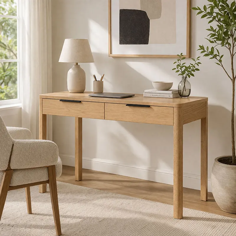 A modern oak study desk with drawers for bedrooms, study corners, and home offices in the UAE.