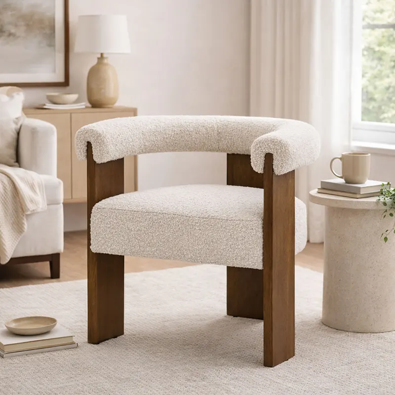 Luxury lounge chair UAE with modern accent chair Dubai styling, premium boucle lounge chair texture, designer armchair UAE elegance and contemporary lounge chair comfort for refined interiors.