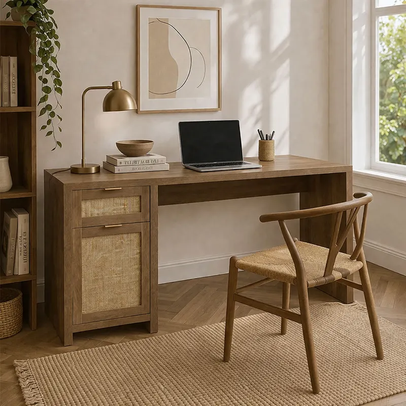 Whether you need a wooden desk with rattan for work or a study desk Dubai for compact living. Hence this design fits effortlessly across apartments and villas. While it saves space, it still offers a smooth working surface and organized storage. As a modern cane desk UAE, it blends clean lines with natural textures, creating a workspace that feels calm, stylish, and efficient.
