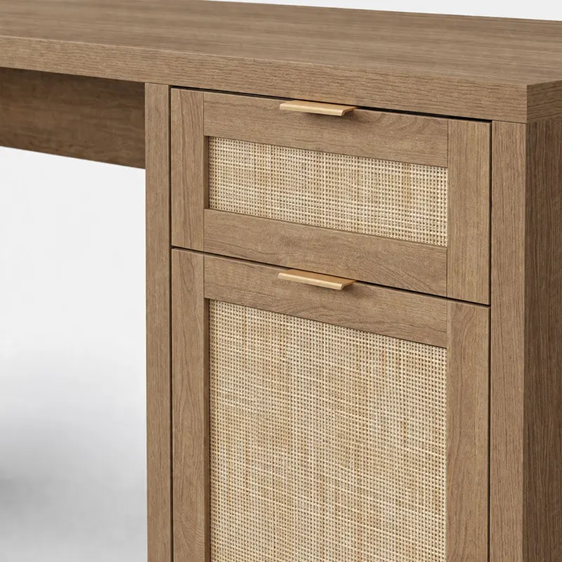 A modern oak desk with elegant cane panel detailing, designed for compact spaces while offering a smooth working surface, practical drawer and cabinet storage, and a warm, stylish workspace solution for homes and offices across Dubai.