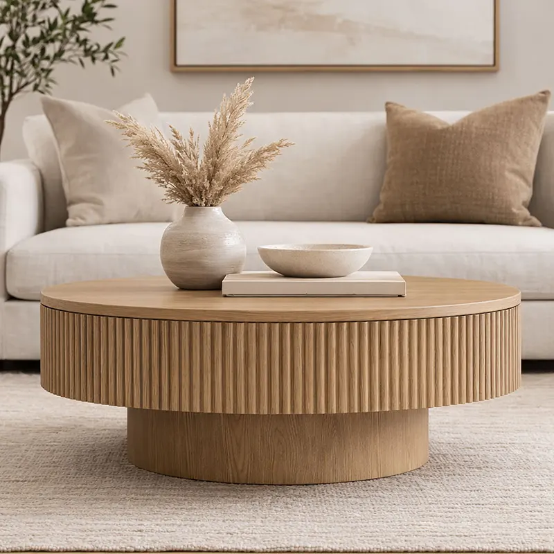 Crafted with a solid frame, this fluted coffee table UAE model ensures durability and long-term performance. The drum coffee table Dubai collection highlights a strong wood build with an elegant oak tone finish, while the round coffee table UAE structure creates a soft visual flow across the room. With a smooth surface and rounded edges, this modern coffee table Dubai is both practical and stylish, and its balanced proportions enhance the luxury coffee table UAE appeal.
