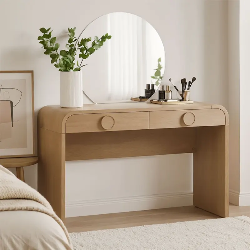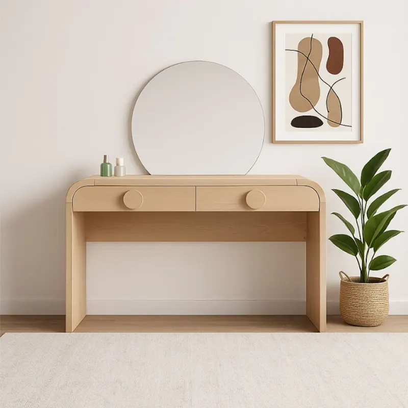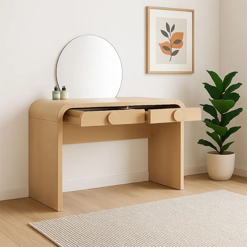 The Vetra Vanity Table is a modern piece that blends elegance with practicality. Whether you need a dressing table in UAE, a custom made vanity desk, or a luxury dressing table Dubai, this design fits beautifully into your bedroom. With its natural veneer finish and sleek round edges, it offers a timeless look while ensuring durability. The half-moon mirror becomes the centerpiece, adding character and charm to your space.