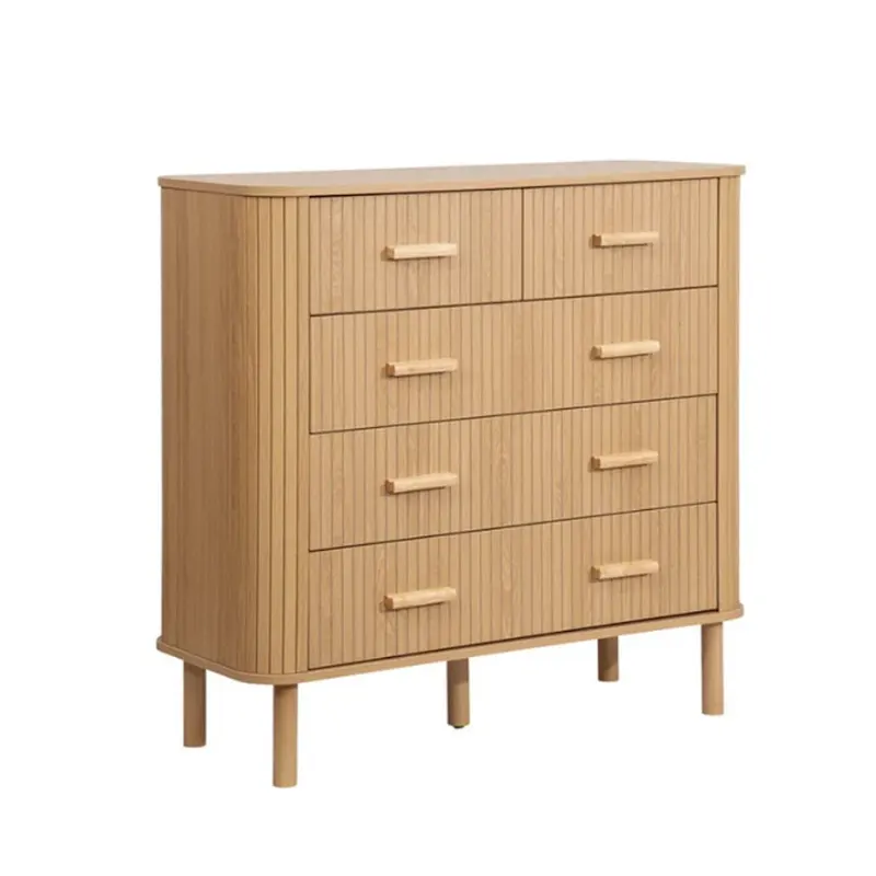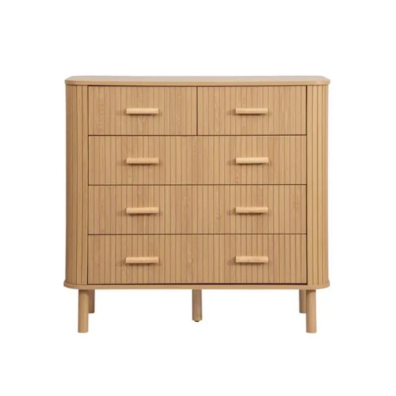 The Virto Chest of Drawer by HOC Furniture features a natural veneer finish, fluted panels, and five soft close drawers. This custom made drawer UAE offers modern function as a wooden dresser with fluted panels, while its raised legs and Nordic style make it a perfect bedroom storage cabinet UAE.